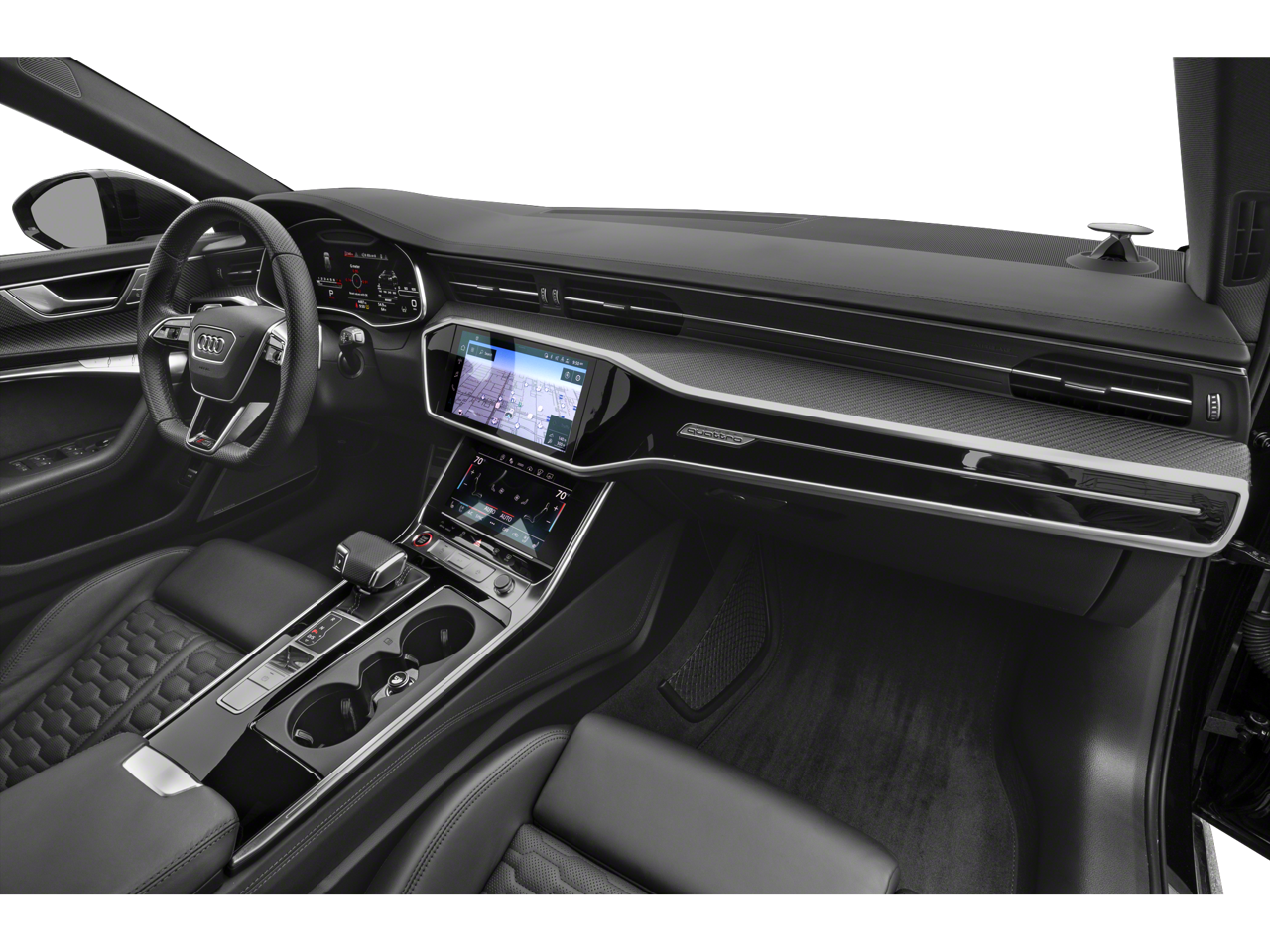 Black Optic Exterior Package, Black Optic Package (Black Roof Rails, High-Gloss Black Exterior Mirror Housings, and Wheels: 22 5-V-Spoke Trapezoid Design), Driver Assistance Package (Adaptive Cruise Assist w/Lane Guidance, Audi Side Assist, Intersection Assist, and Traffic Sign Recognition), Executive Package (Head-Up Display, Heated Rear Seats, and Power Soft-Closing Doors), Extended Leather Package, Leather Package, Red RS Design Package (Alcantara Steering Wheel, Shifter & Center Console, Red Contrast Stitching, RS Logo Floor Mats w/Red Contrast Stitching, and Seat Belts w/Red Edging), Auto High-beam Headlights, Bang & Olufsen 3D Premium Sound System, Brake assist, Heated & Ventilated Front RS Sport Seats, Heated front seats, Heated steering wheel, Power Liftgate, Power moonroof, Sport Exhaust, Ventilated front seats, 16 Speakers, 4-Wheel Disc Brakes, ABS brakes, Adaptive suspension, Air Conditioning, Alloy wheels, AM/FM radio: SiriusXM, Auto tilt-away steering wheel, Auto-dimming door mirrors, Auto-dimming Rear-View mirror, Auto-leveling suspension, Automatic temperature control, Bumpers: body-color, Compass, Delay-off headlights, Driver door bin, Driver vanity mirror, Dual front impact airbags, Dual front side impact airbags, Electronic Stability Control, Emergency communication system: Audi connect CARE, Exterior Parking Camera Rear, Four wheel independent suspension, Front anti-roll bar, Front Bucket Seats, Front Ce