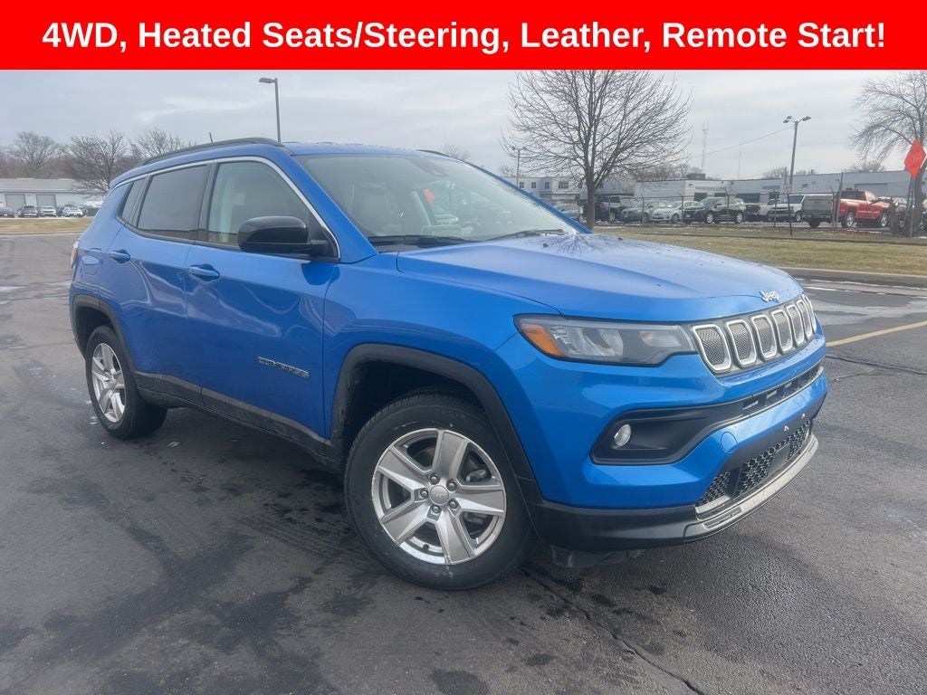 Laser Blue Pearlcoat 2022 Jeep Compass Latitude 4D Sport Utility 4WD 9-Speed 948TE Automatic 2.4L I4 22/30 City/Highway MPG